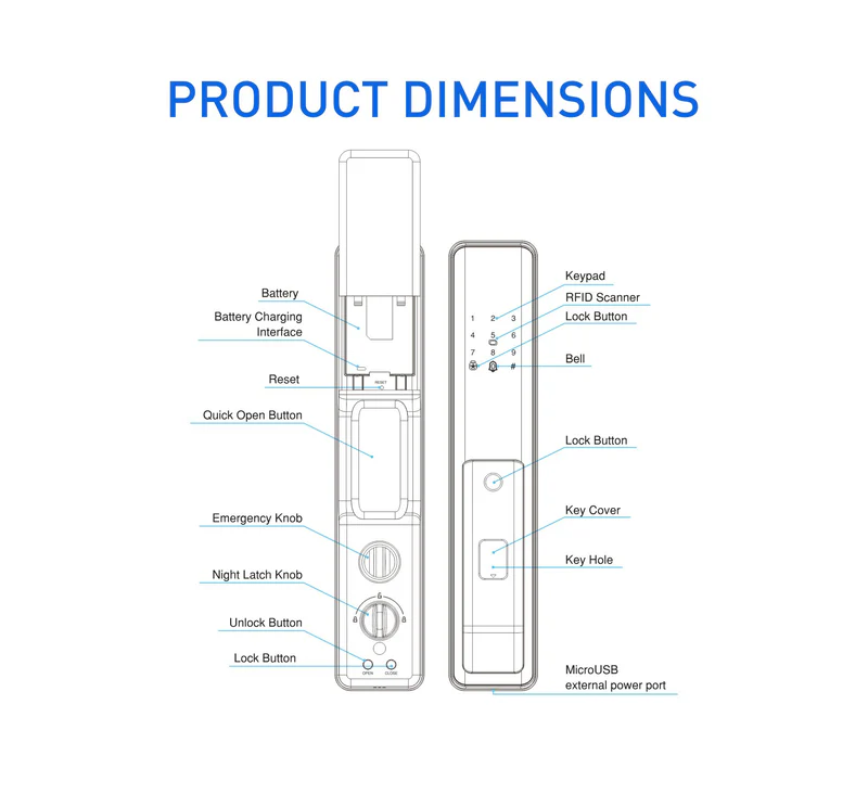 - Emergency Battery Backup - If the battery is completely drained, the lock can be connected to a power bank through the USB port to regain access for a while.